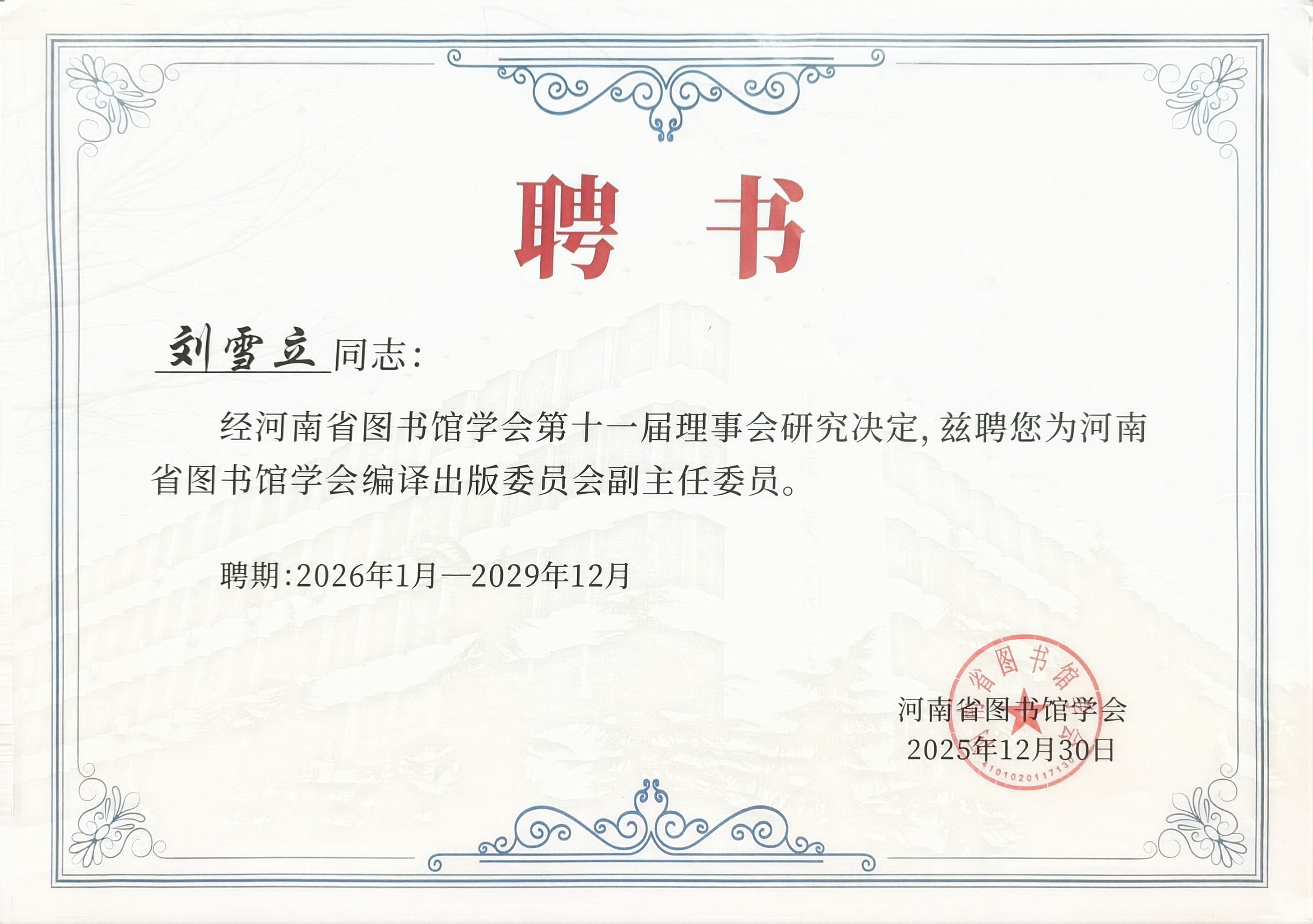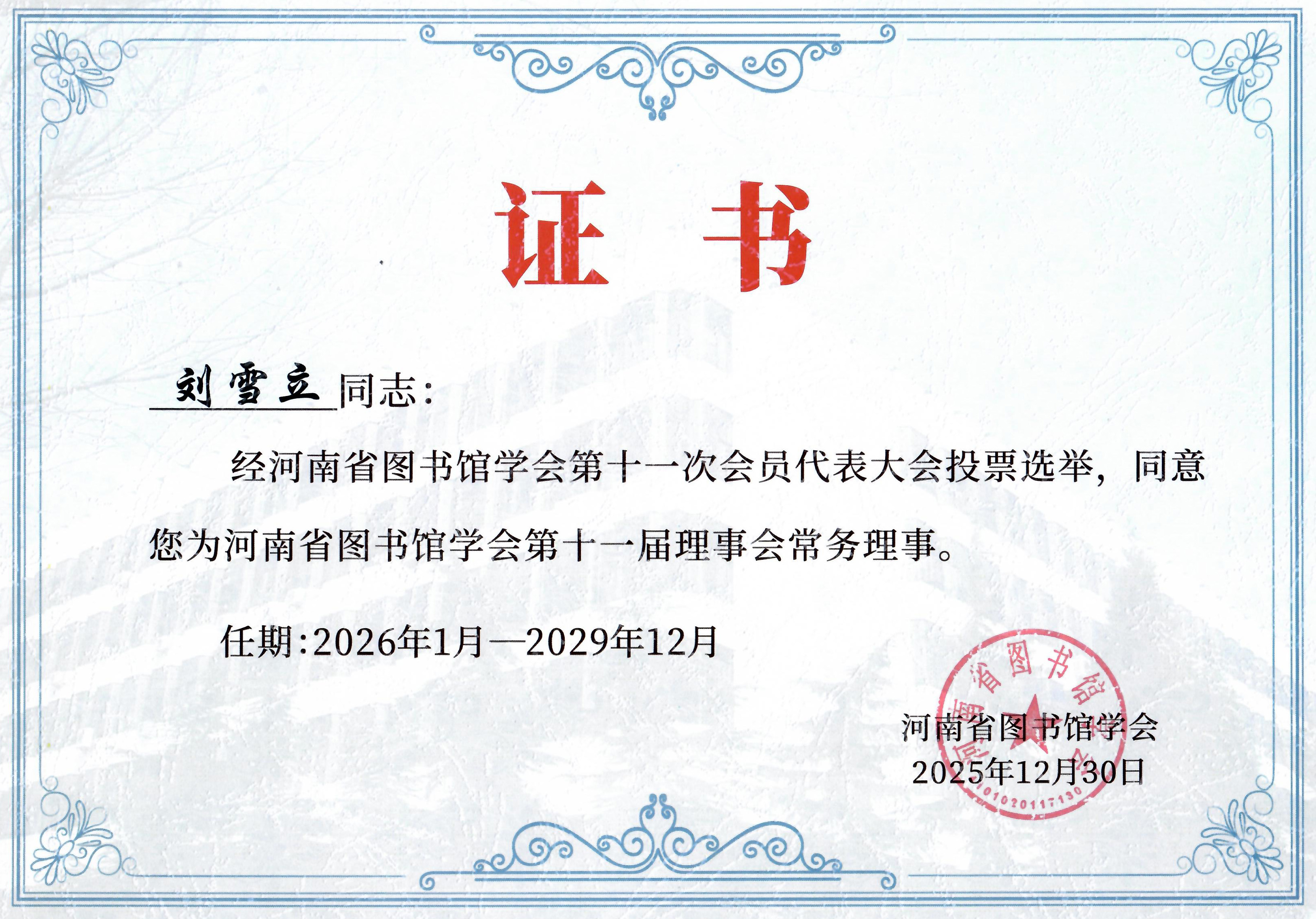 在刚刚结束的河南省图书馆学会第十一次会员代表大会暨十一届一次理事会上,我校图书馆成功当选为常务理事单位,图书馆馆长刘雪立当选常务理事。同时,刘雪立受聘担任河南省图书馆学会编译出版委员会副主任委员。