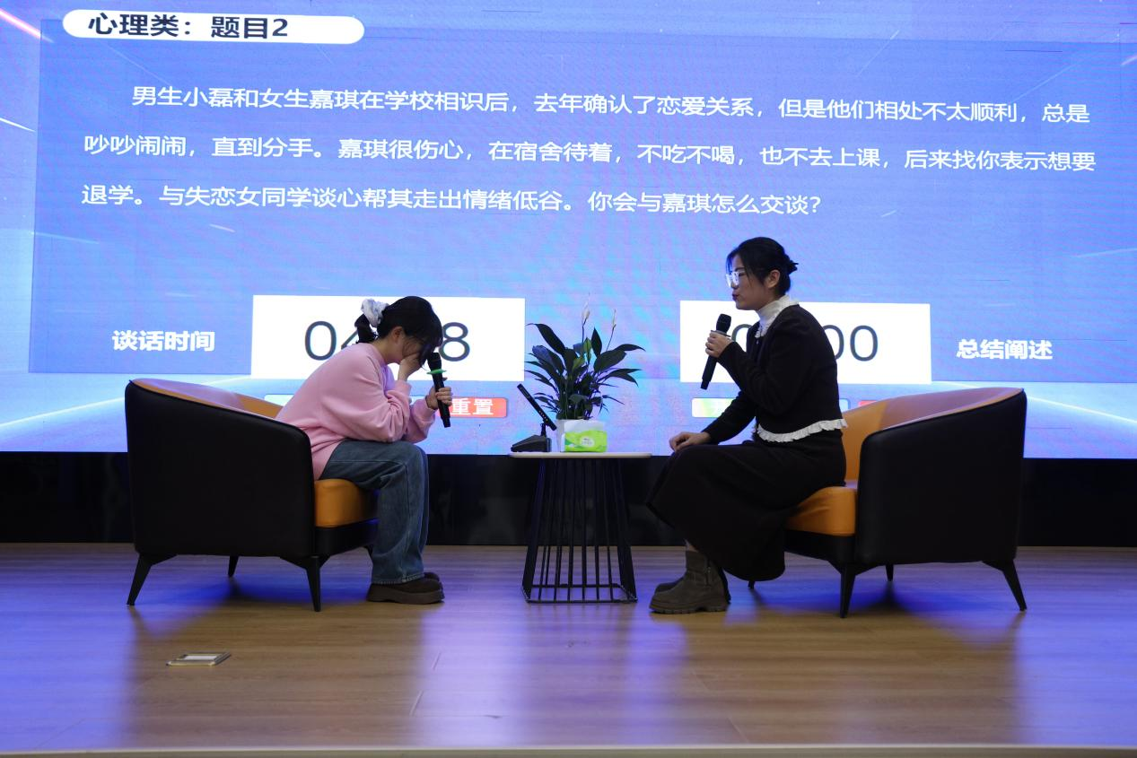 比赛中,辅导员们面对各类模拟情境,沉着应对、循循善诱,对问题展开系统分析与精准研判,并提出了具体可行的解决策略,充分体现出“听得懂、听入心、精准析、精准助”的职业素养与沟通艺术。他们在谈话中抽丝剥茧,既化解问题于无形,又建立起师生之间的信任桥梁。