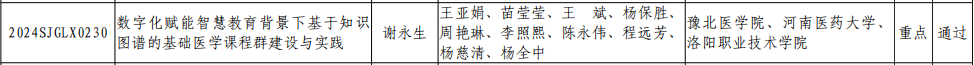 近日,由豫北医学院基础医学院谢永生副教授主持的河南省高等教育教学改革研究与实践重点项目(项目编号:2024SJGLX0230)——“数字化赋能智慧教育背景下基于知识图谱的基础医学课程群建设与实践”,经专家评审鉴定顺利结项。这一成果不仅标志着该校院(部)主持省级重点教改研究项目实现“零的突破”,更成为河南省高等医学教育数字化转型的典型实践案例。