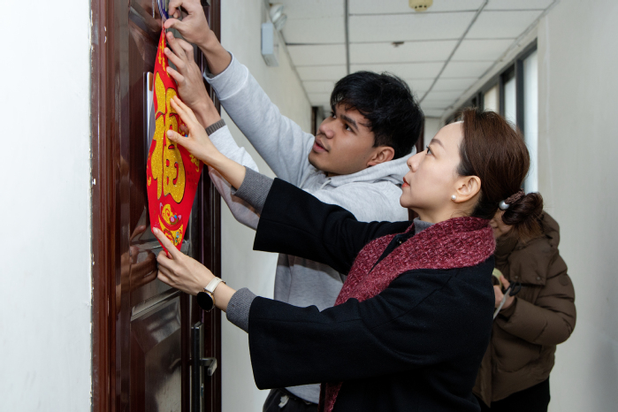 “新年好呀,新年好呀……”平原校区的国际学生公寓前,留学生们弹着吉他,唱起了《新年好》,不同肤色的脸庞上绽放着同样的喜悦,仿佛一曲“四海一家”的和谐乐章。“一日三餐一定要吃好!”“最近和家里人视频了吗?假期有什么计划?”校领导与国际学生们亲切交谈,关切地询问他们的生活与学习情况。温暖的问候,贴心的叮嘱,让远离家乡的学子们感受到家的温馨。大家还一起动手贴春联,红纸金字间,流淌着中华传统文化的韵味,也映照着跨越国界的情谊。