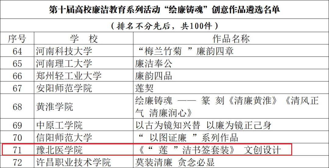 第十届全国高校廉洁教育系列活动由教育部办公厅部署开展,以“清风育德守初心 廉洁笃行担使命”为主题,经个人申报、学校推荐、河南省教育厅审核、全国专家集中评审层层遴选确定结果。我校报送的作品紧扣主题,以“莲”寓“廉”,将中华优秀传统文化与廉洁精神深度融合,创意新颖、内涵深刻,兼具艺术性与实用性,其思想性、创新性和教育性获评审专家高度认可。