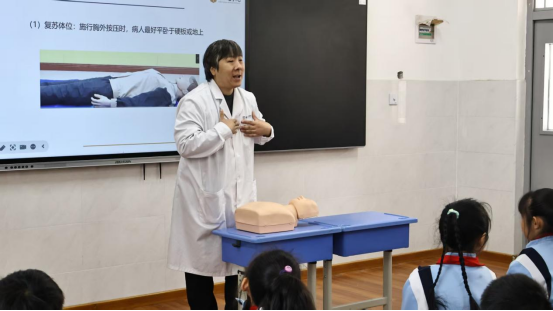 课堂教学环节,临床学院王宇老师受邀担任主讲,结合校园真实安全案例,围绕气道异物梗阻、溺水、心跳骤停等青少年日常易遭遇的突发事件,深入浅出讲解事故识别方法与规范处置流程。从心肺复苏的按压标准、操作频率,到海姆立克急救法的发力技巧,王宇对每项急救技能的关键要点进行现场示范、细致拆解,向同学们传递“先判断、再呼救、后施救”的急救核心原则,现场学生积极互动、踊跃提问,学习氛围浓厚,安全防护与应急救护的认知得到进一步深化。