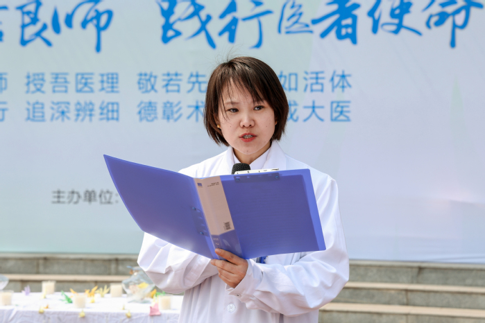 誓言传承环节,两场宣誓仪式层层递进,凝聚守护生命的青春力量,彰显医学担当。首先,由解剖学教师代表领誓,全体学子重温解剖学誓言:“无言良师、授吾医理、敬若先贤、临如活体、正心恭行、追深辨细、德彰术精、修成大医”,誓言铿锵,字字千钧,传递着对大体老师的敬畏与学好解剖学的坚定决心;随后,由学生代表领誓,全体学子身着白大褂,肃立重温医学生誓词,“健康所系,性命相托”的誓言响彻全场,将对生命共同体的敬畏,转化为学医行医的责任与动力,坚定了“救死扶伤、不辞艰辛”的医者信念。