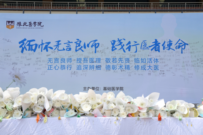 宣誓仪式落下帷幕后,随即开展大体老师致敬实践活动。学生代表手捧鲜花与亲手折叠的心愿千纸鹤,向大体老师敬献,每一朵鲜花都承载着感恩,每一只千纸鹤都寄托着敬意;随后,学子们肃立默哀,表达对大体老师的深切缅怀。在“我想对他说”签名环节,学子们有序在签名墙上签名,将想对大体老师说的心里话郑重书写在墙上,诉说敬畏、感恩与践行医者使命的承诺。此外,活动还布置了课外延伸任务,引导学子课后给大体老师写一封信,将内心的敬意与感悟诉诸笔端,让对大体老师的感恩与敬畏真正融入日常,深化生命教育成效。