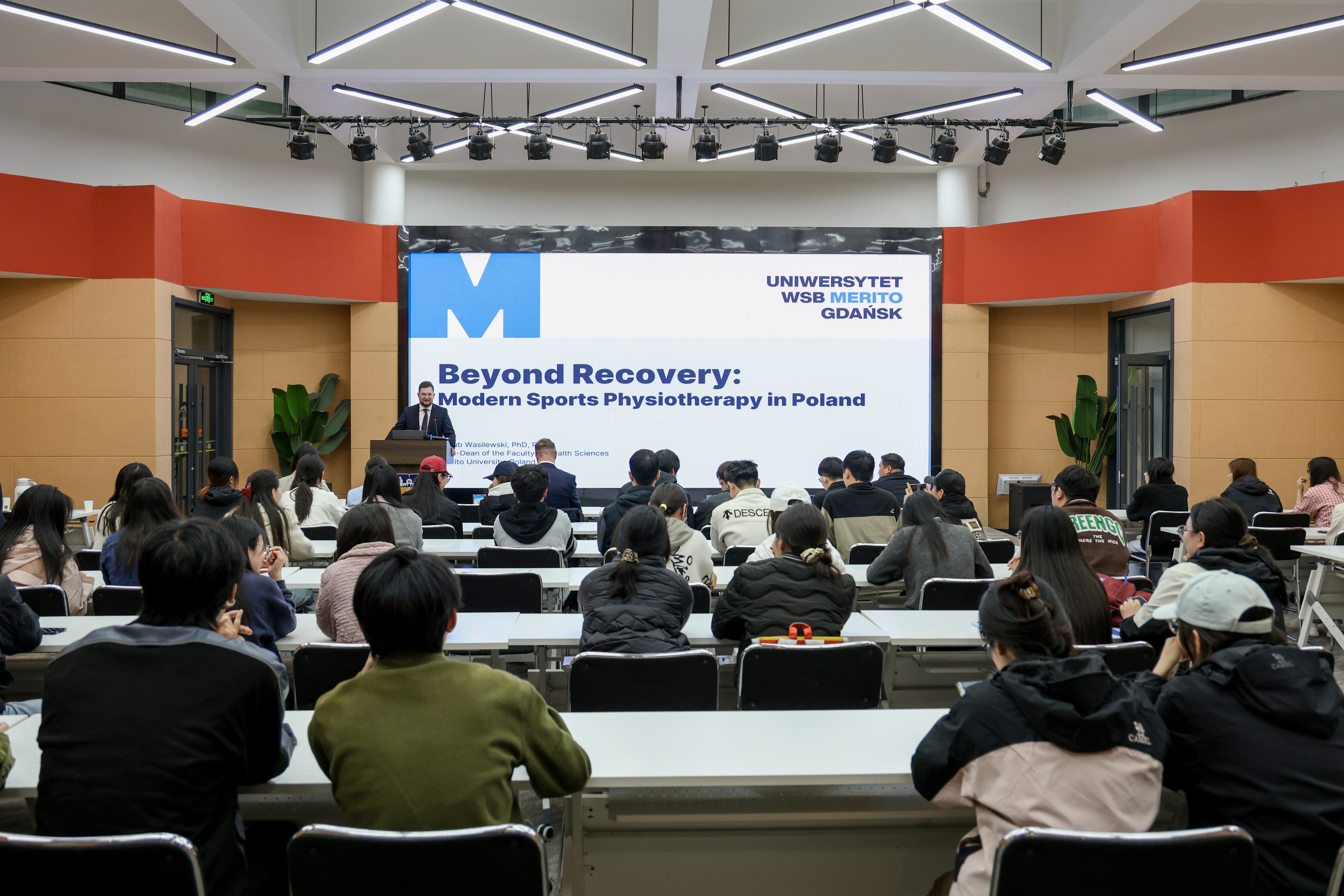同期,波兰格但斯克WSB梅里托大学健康学院副院长Jakub Wasilewski在智行书院报告厅为百余名师生作《“超越康复”:波兰运动物理治疗》专题讲座。他系统阐释了波兰运动物理治疗以运动疗法、物理因子治疗、手法治疗与按摩为核心的四大技术体系,结合自身担任国家队医疗领队的经历分享了丰富的临床案例,并通过互动环节详细解答师生提出的疑问。讲座现场气氛活跃,为师生搭建了接触国际前沿康复理念、拓宽学术视野的宝贵平台。
