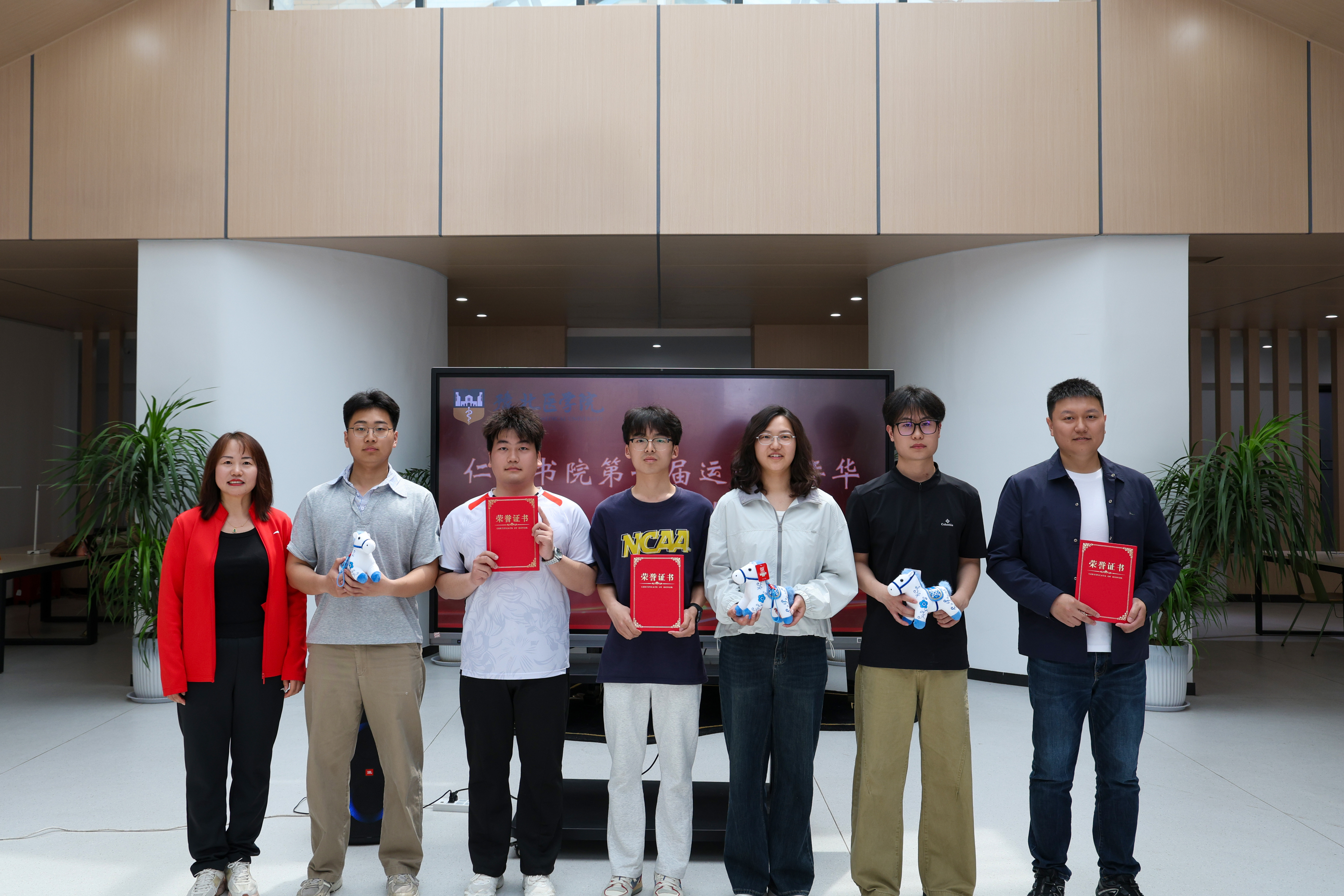 拔河决赛暨闭幕式现场,学校副校长白国强与各行政、学院负责人共同参加,并为各项目获奖班级颁奖。拔河决赛中,三强班级轮番上阵、拼尽全力,红绳在中线反复拉锯,最终决出冠亚季军。随后的颁奖环节中,一个特别的“体育风尚奖”格外引人注目——四个未获奖班级的辅导员与班长一同上台,手持奖状,齐声高喊:“实力不够,欢乐来凑!”全场掌声与笑声交织,他们用最快乐的方式为本次体育嘉年华画上句号。