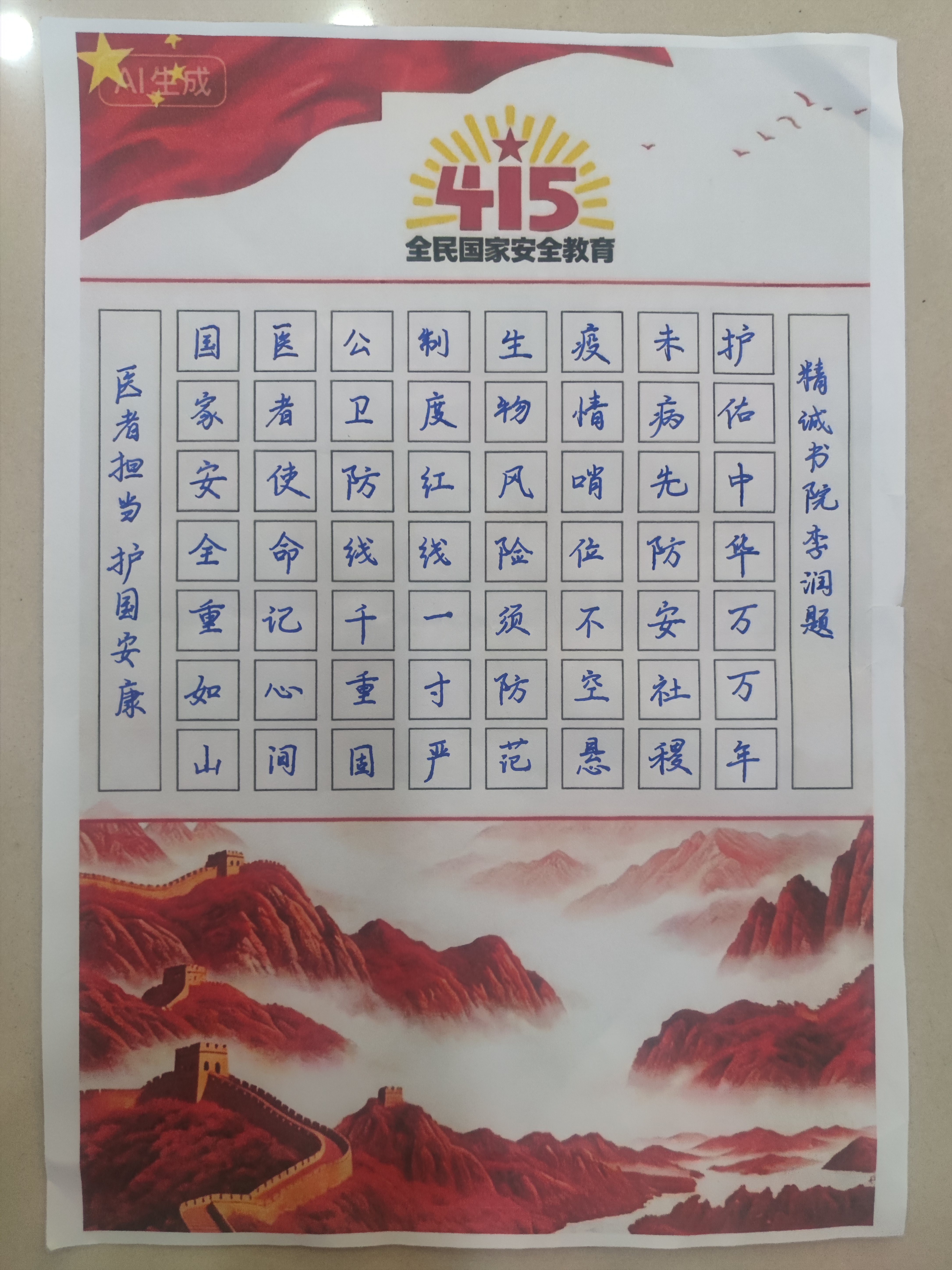 创意青春表达,讲好国安故事。书院面向学生开展“我身边的国家安全”文创作品及“我的国安行医格言”征集活动,共收到书法、海报、视频、手工等作品129件。同学们融入白大褂、红十字、医学影像等专业元素,以青春视角诠释国家安全内涵,10余件优秀作品在书院官方微信、管抖平台展出,扩大了教育覆盖面与影响力。